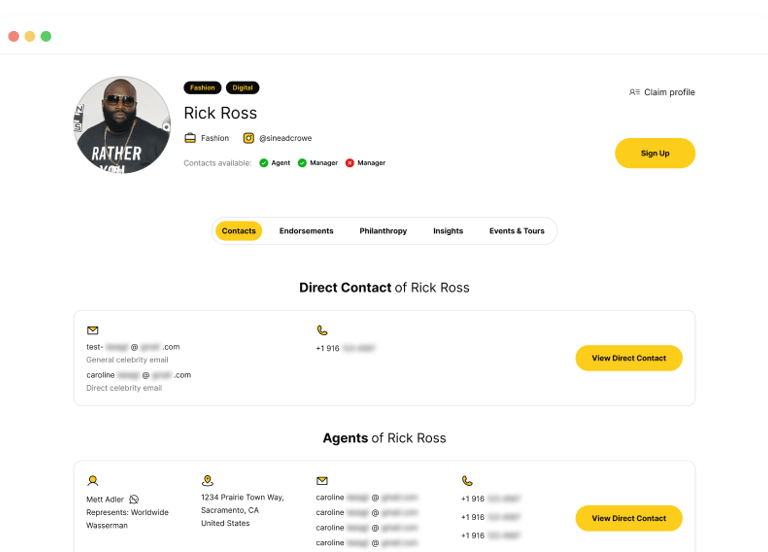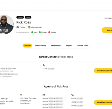 Get contact details for celebrity's management team (agent, manager, publicist)